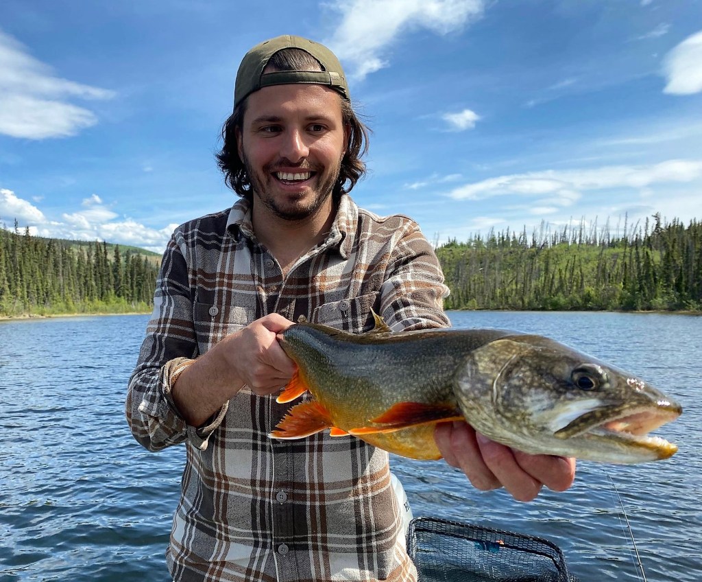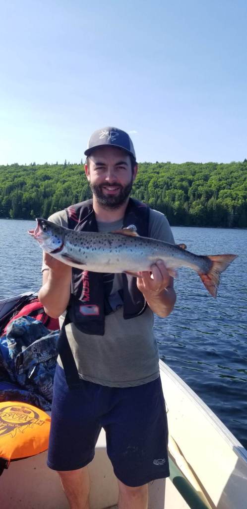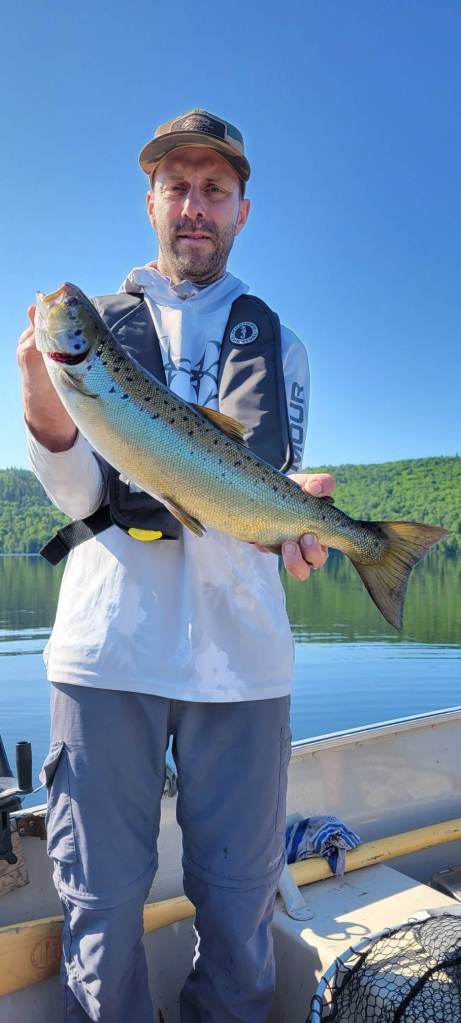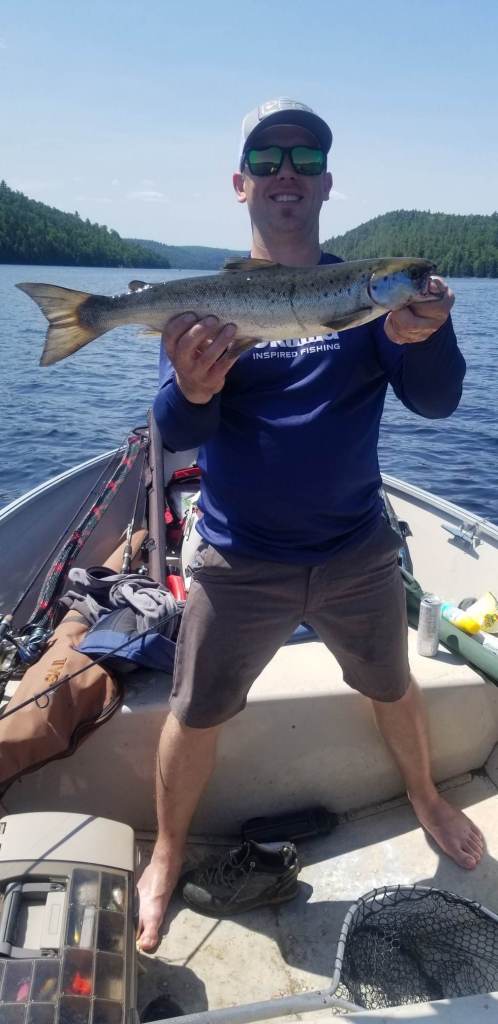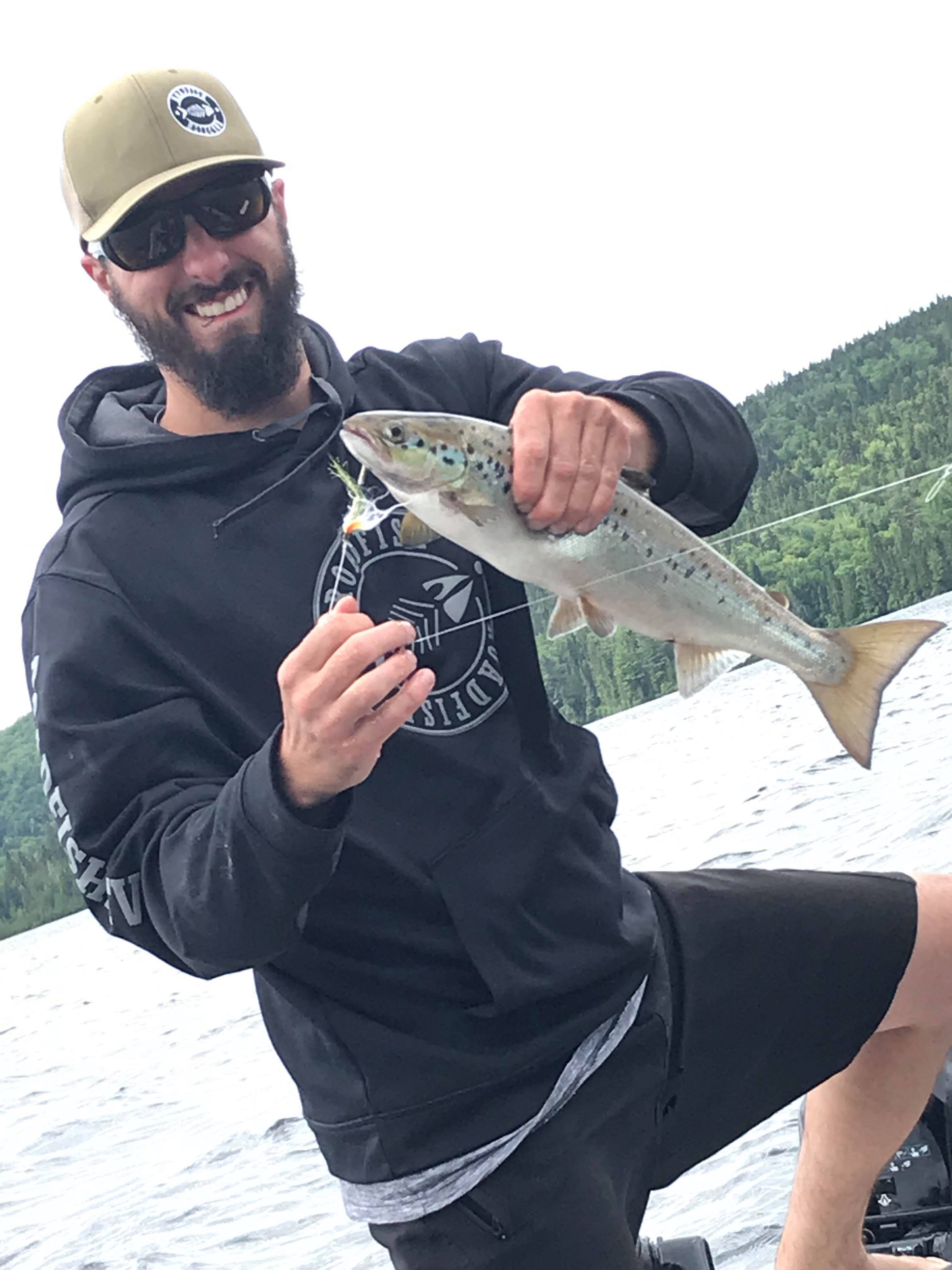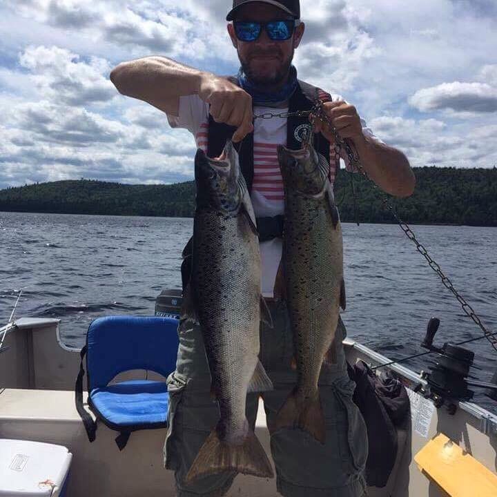 Alex Simard avec 2 belles prises donc une belle ouananiche de 8.5 livres et une truite grise capturer avec le streamer Petite Corégone 1