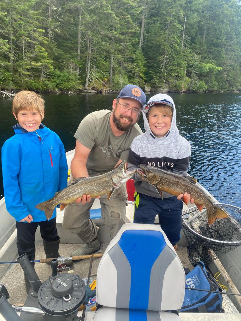 Voici Guillaume Champagne et ces deux fils Théodore et Benjamin avec deux belles truites moulacs de 4 livres et 4 .5 livres prise avec le streamer F.G Éperlan arc en ciel