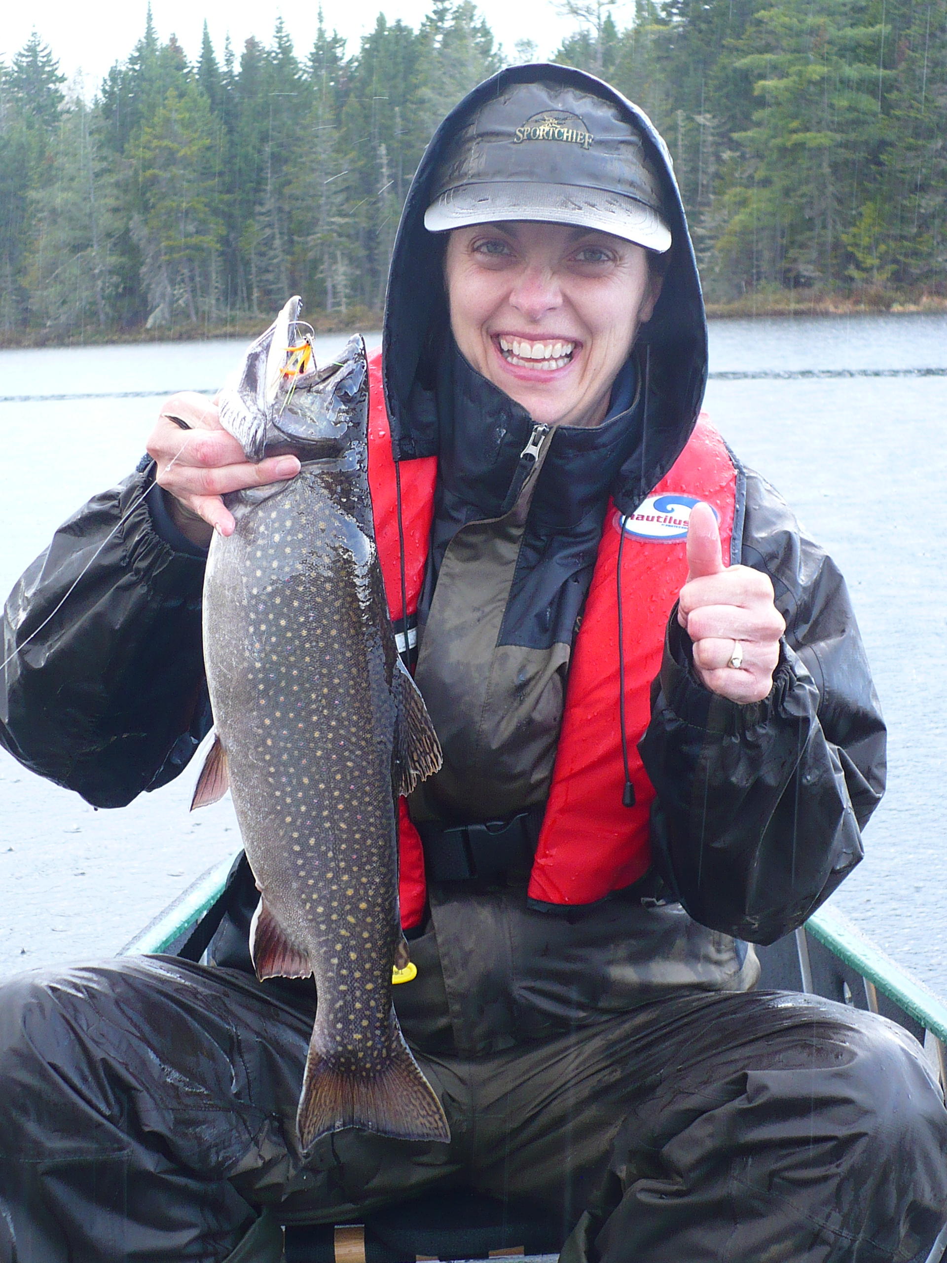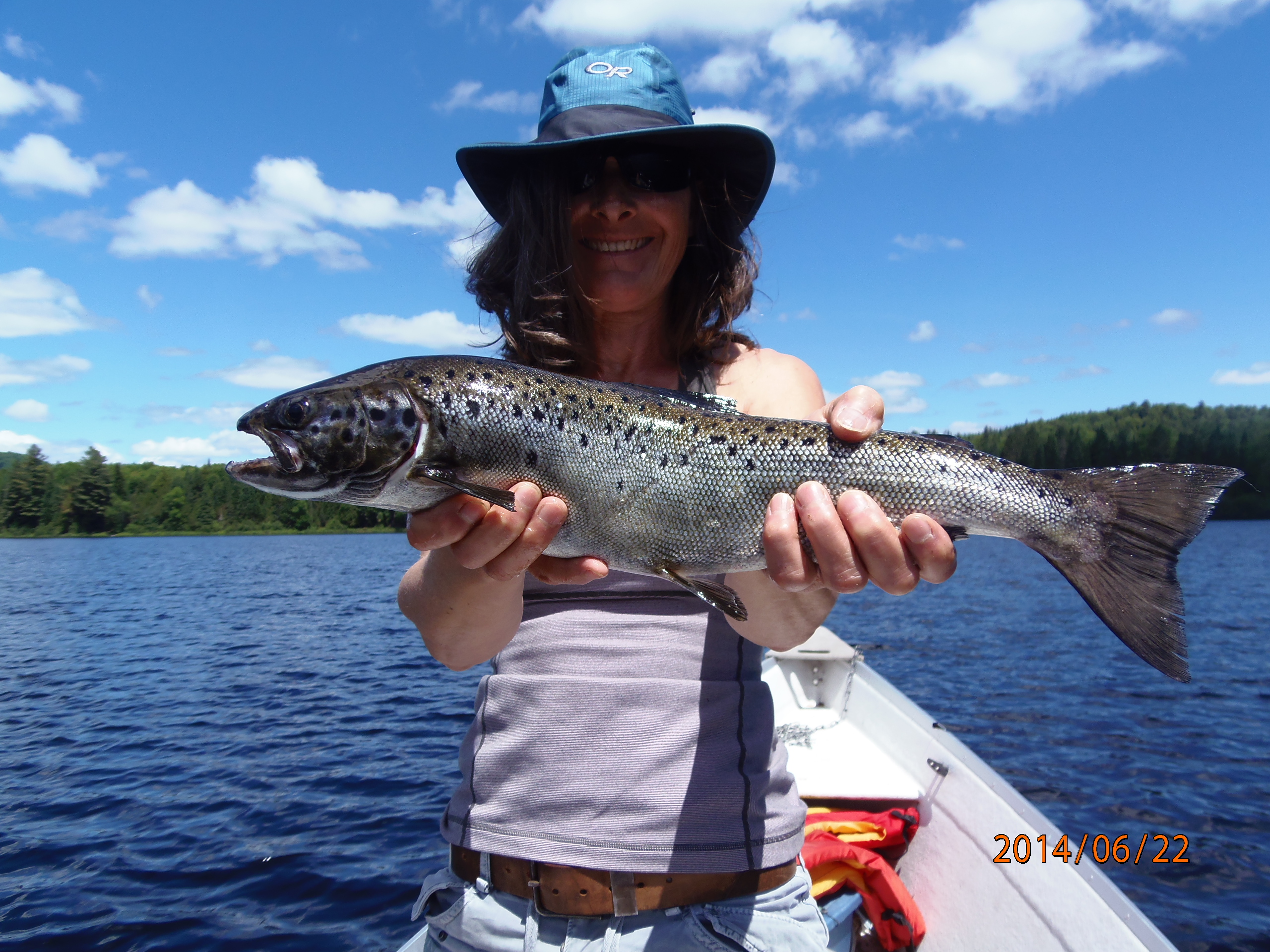 La conjointe de Robert Lacerte ,Caroline Joyal pose fierement avec sa belle ouananiche de 2.2 livres capturer avec le Méné Bleu prise au lac Ernest dans la réserve Papineau Labelle