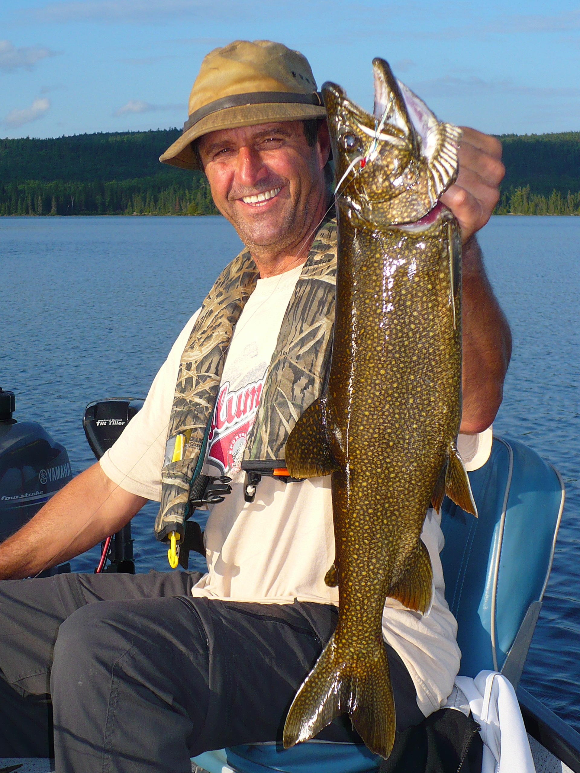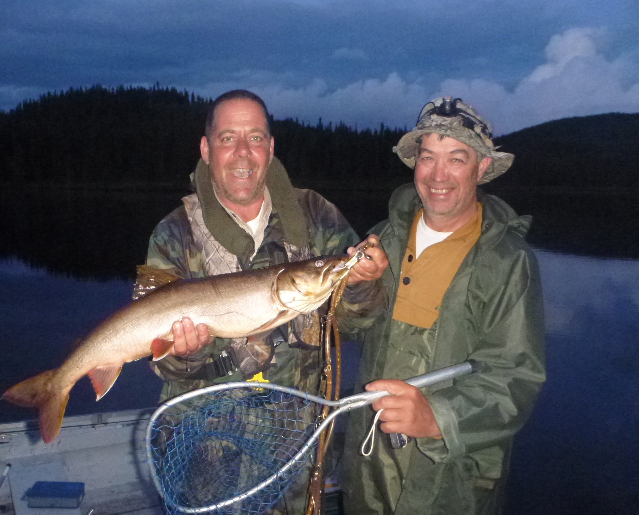 Pierre Villeneuve et Luc Pépin, tous deux de Bécancour, posent fièrement avec cette belle truite grise de 8 livres. Elle a été capturé près du reservoir Manic , par les deux adeptes des Mouches De Frank Guimond. Ah oui, cest la Claire-Y-Belle qui a séduit cette truite grise.