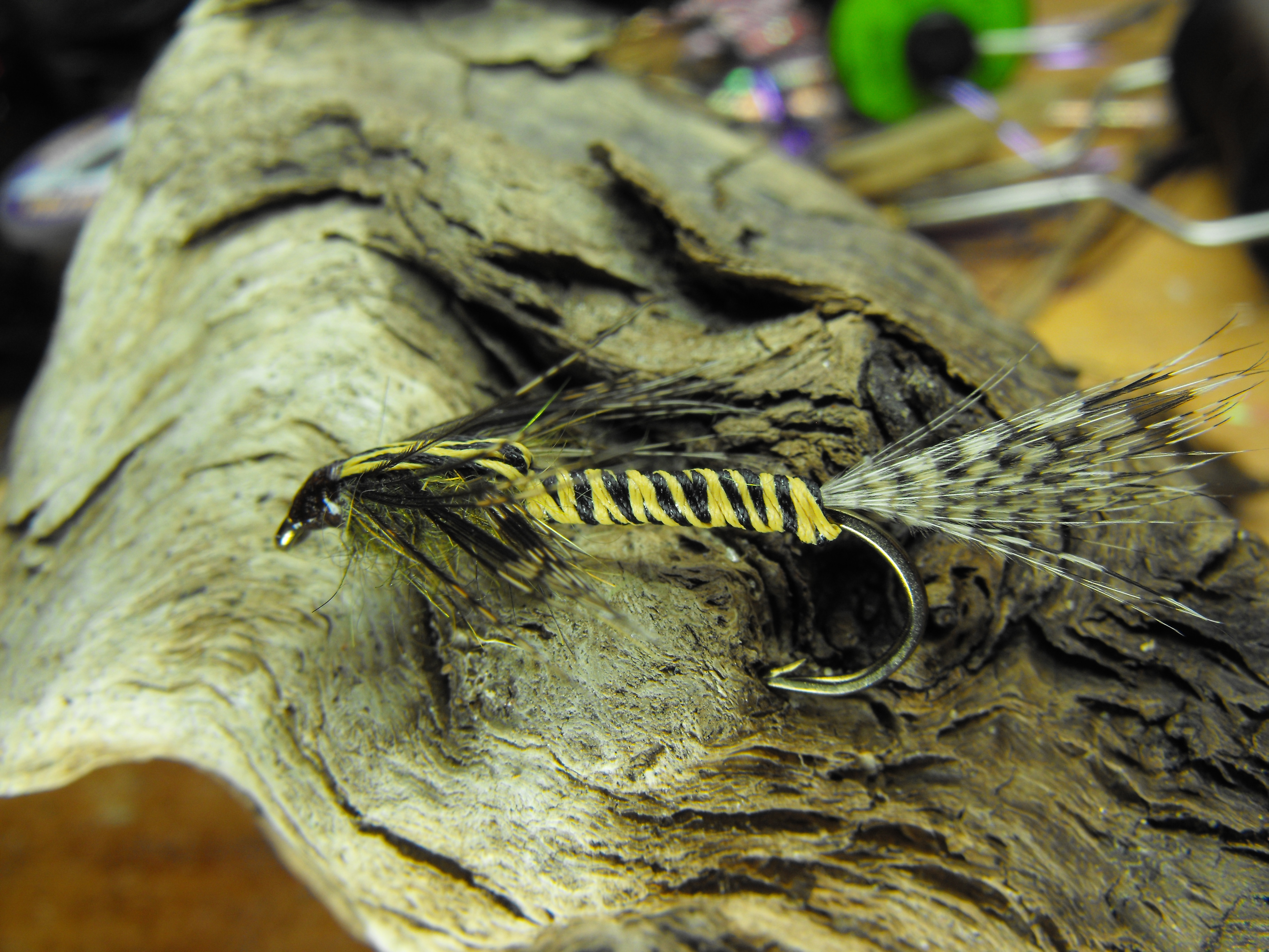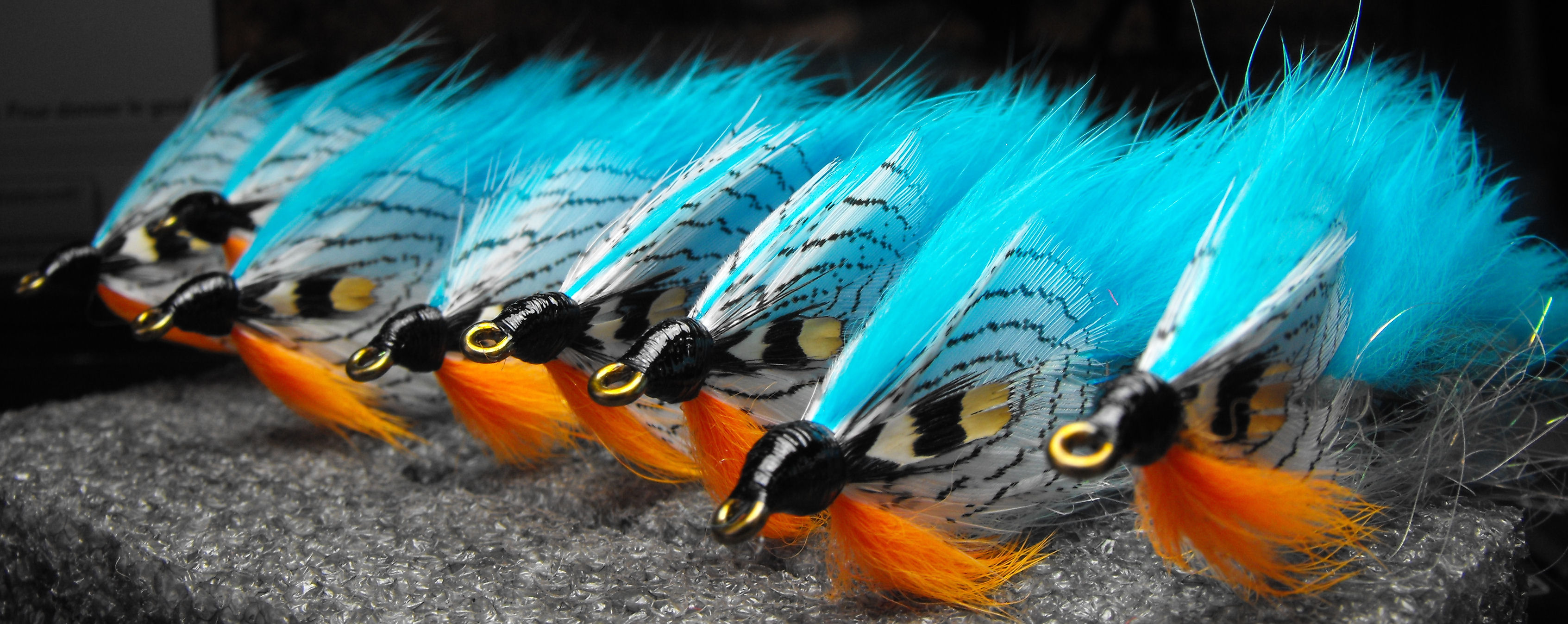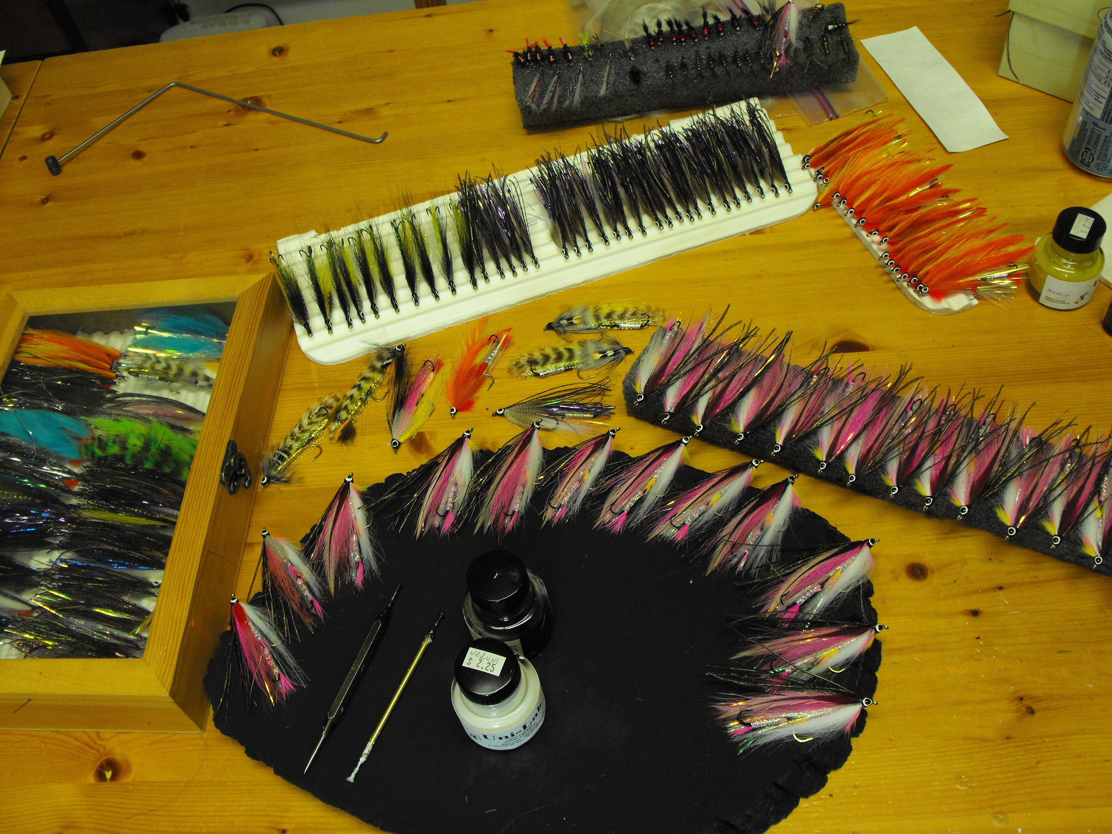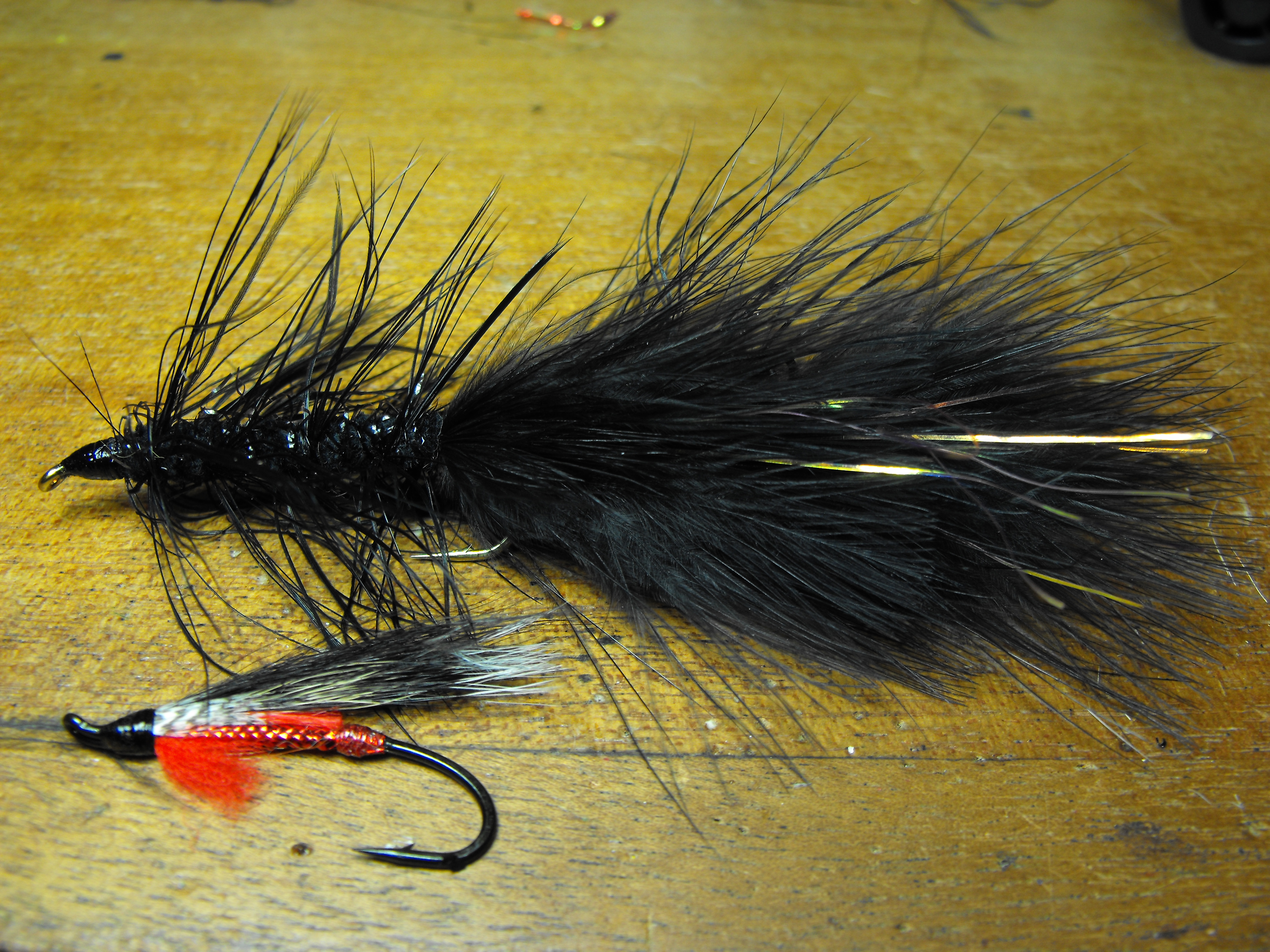 une demande spéciale d’un monteur de mouches que j’ai vue au salon de pêche à la mouche de trois rivières ce pêcheur utilise le woolly bugger pour la pêche a la truite grise et il a beaucoup de succès j’ai oublié sont nom moi pis ma mémoire d’oiseau sur la photo sous le woolly il y as us streamer a saumon hameçon numéro 2 pour comparer la grosseur