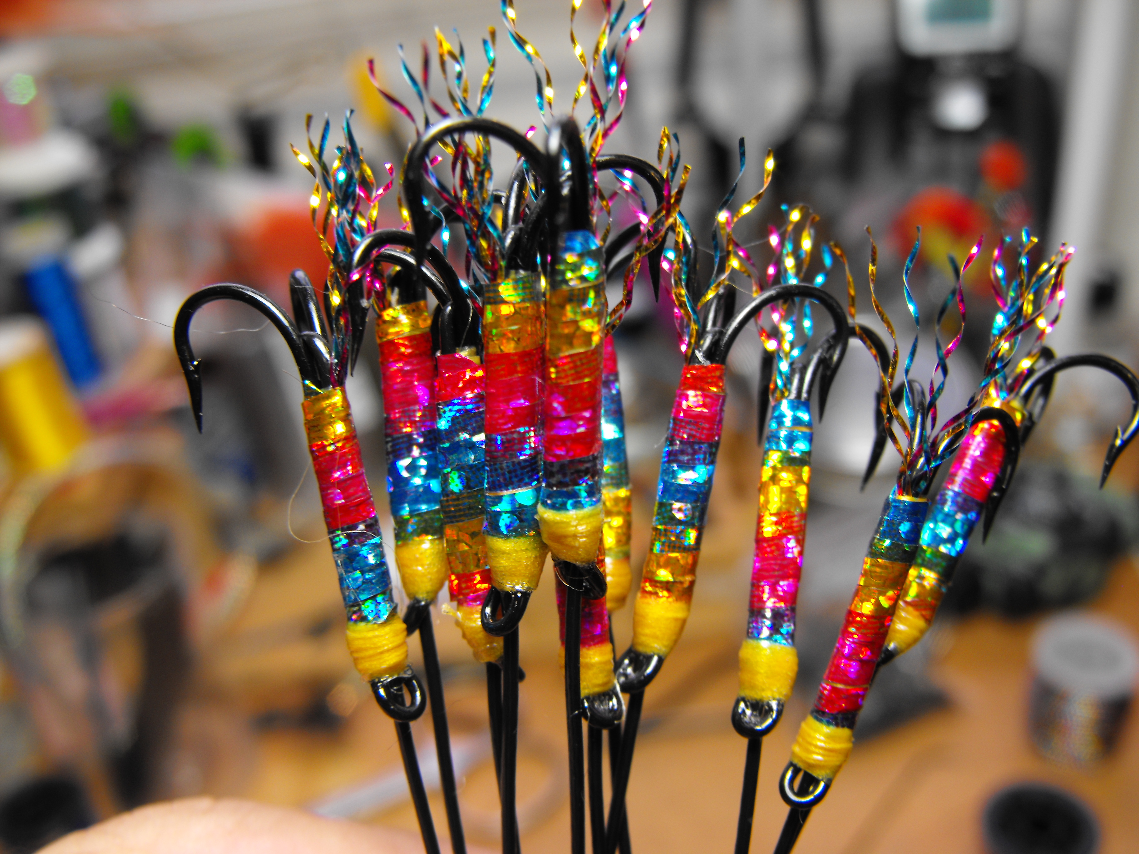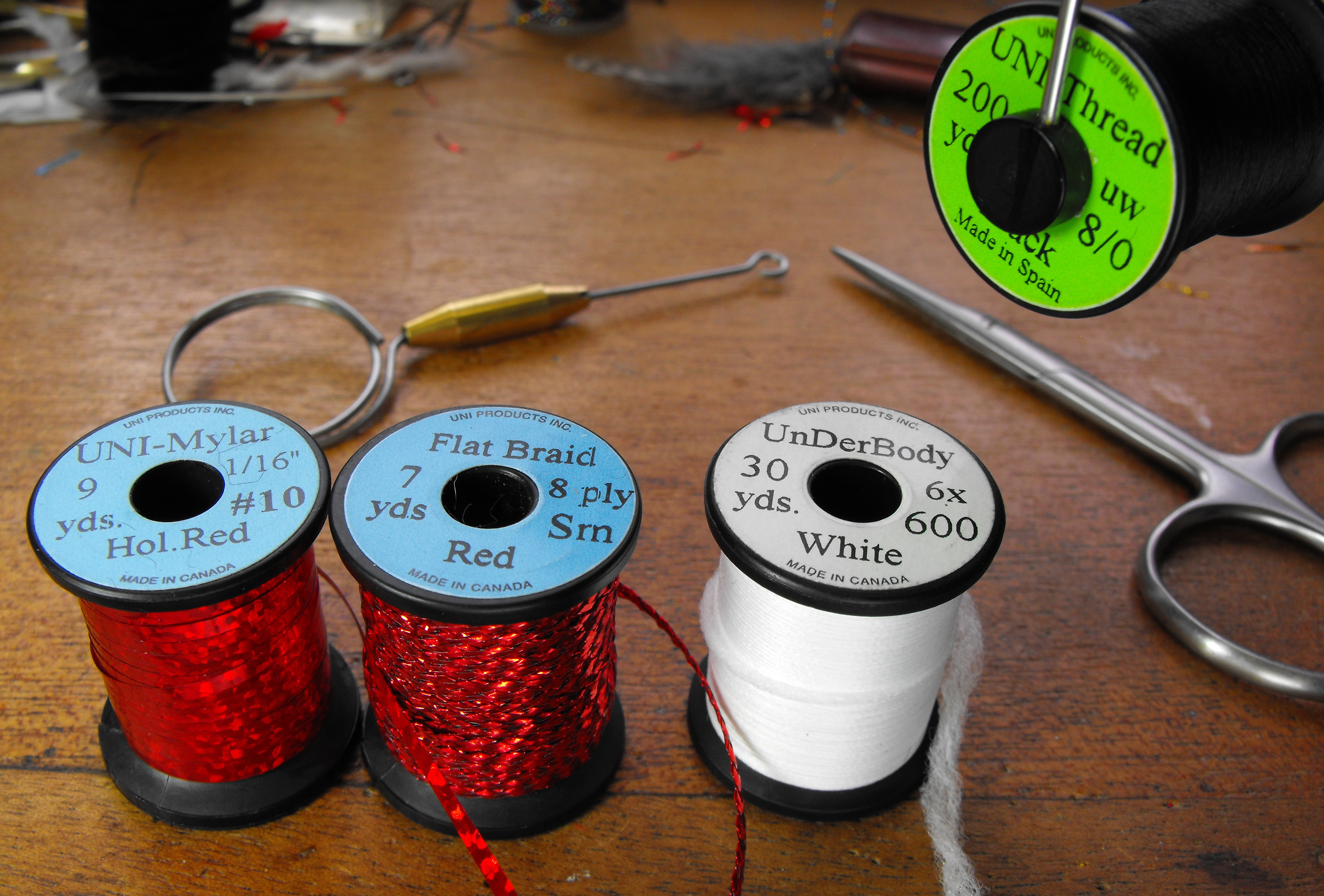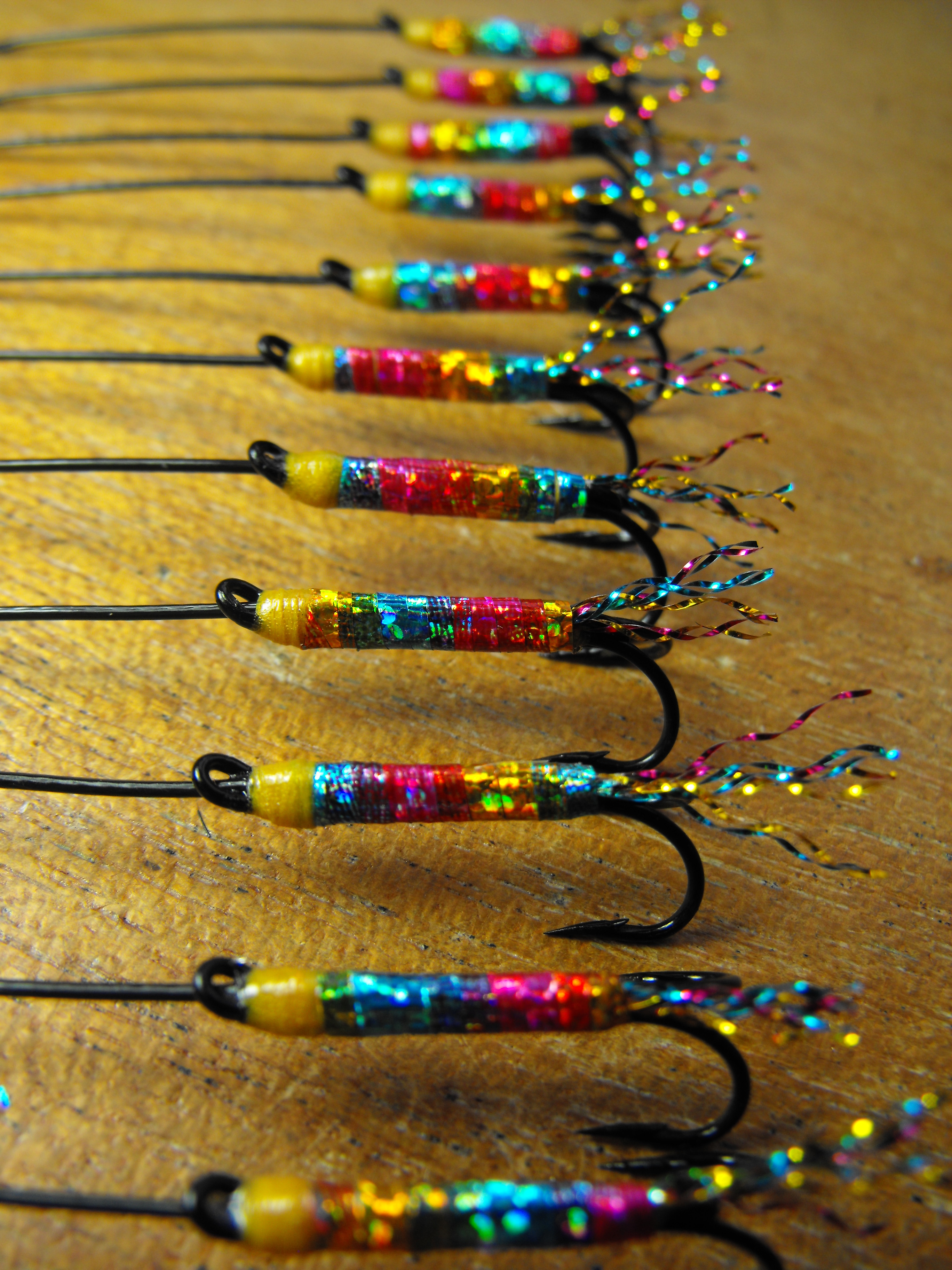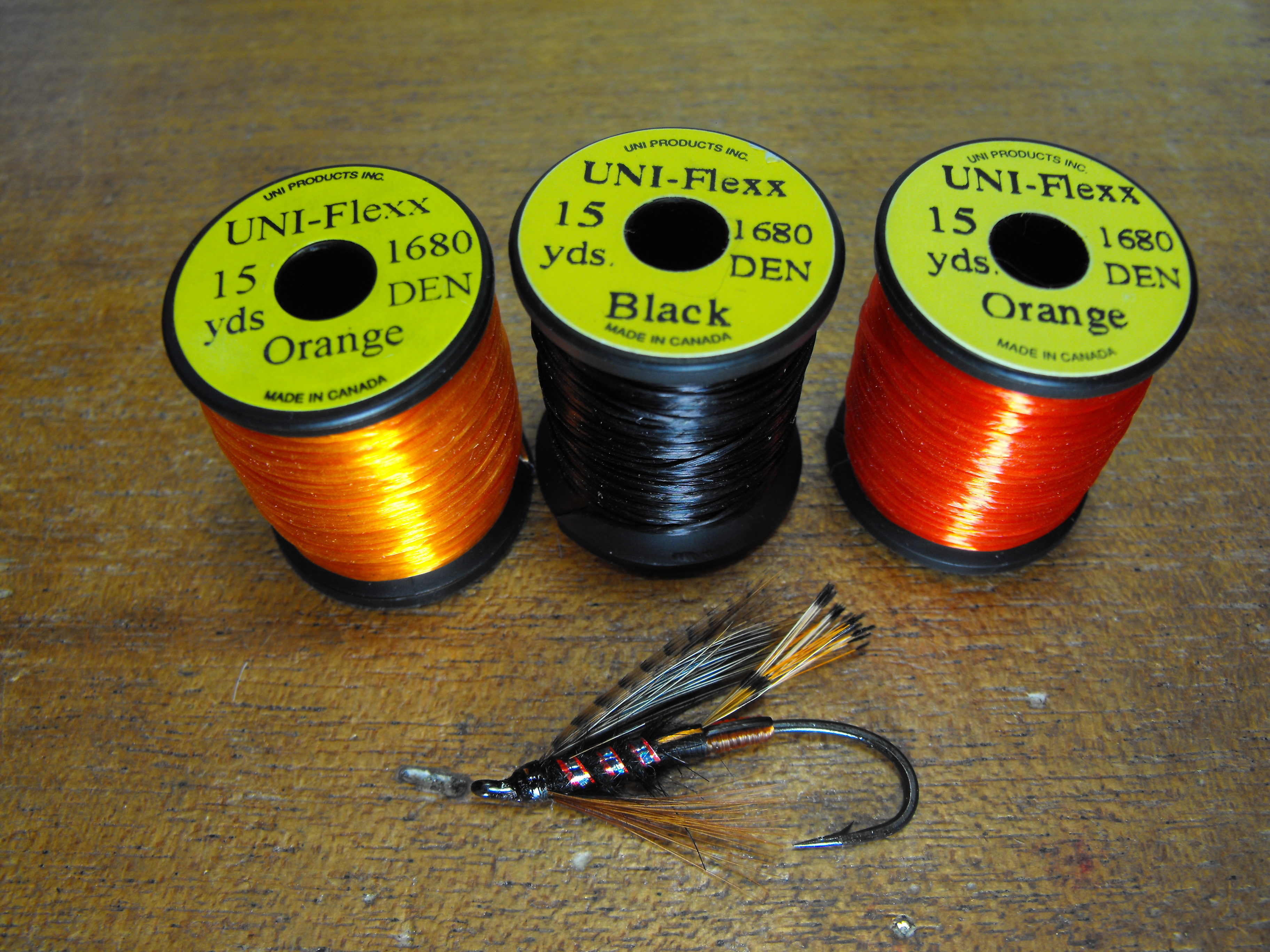 une demande spéciale d’un monteur de mouches que j’ai vue au salon de pêche à la mouche de trois rivières ce pêcheur utilise le woolly bugger pour la pêche a la truite grise et il a beaucoup de succès j’ai oublié sont nom moi pis ma mémoire d’oiseau sur la photo sous le woolly il y as us streamer a saumon hameçon numéro 2 pour comparer la grosseur