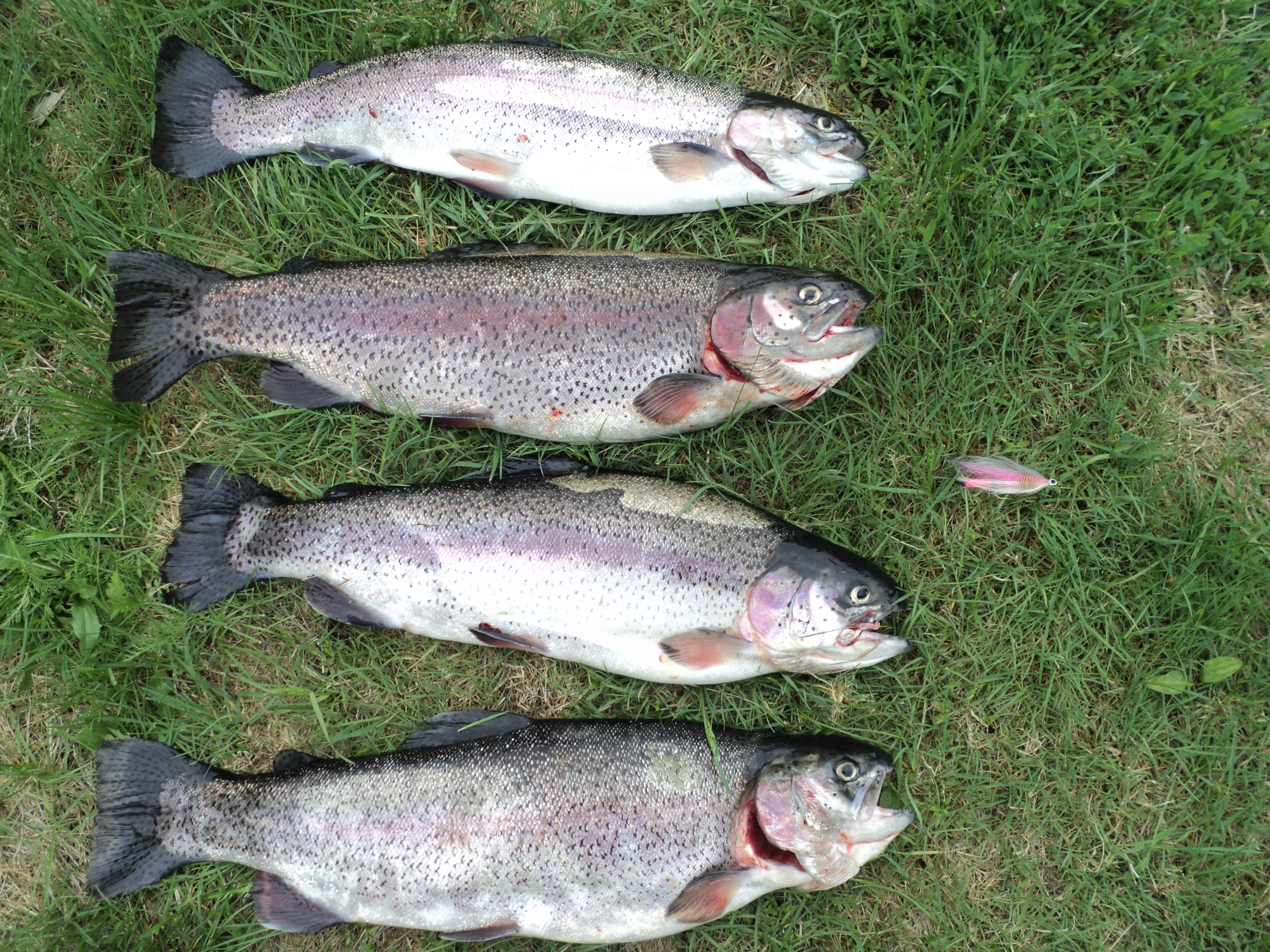 Éric Rabouin de Trois-Rivières, a capturé ces belles truites arc-en-ciel au lac la Roche à la Pourvoirie du Lac Blanc. Le streamer tandem qu’il a utilisé, est la Claire-Y-Belle ce streamer mesure trois pouces, ça vous donne une idée de la longueur de ces truites.