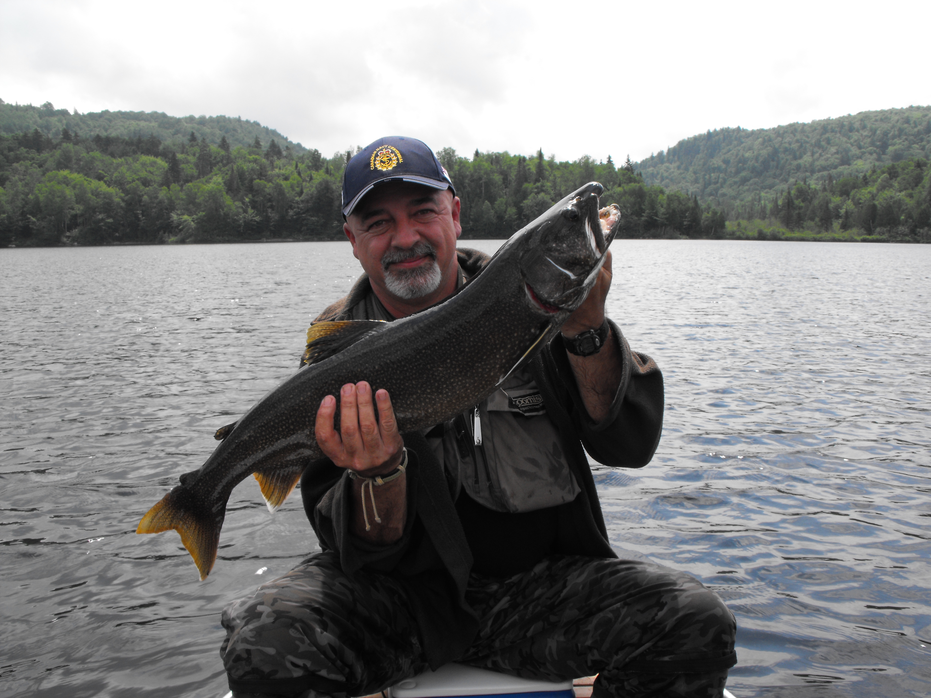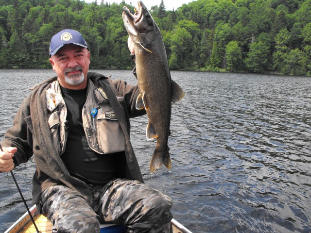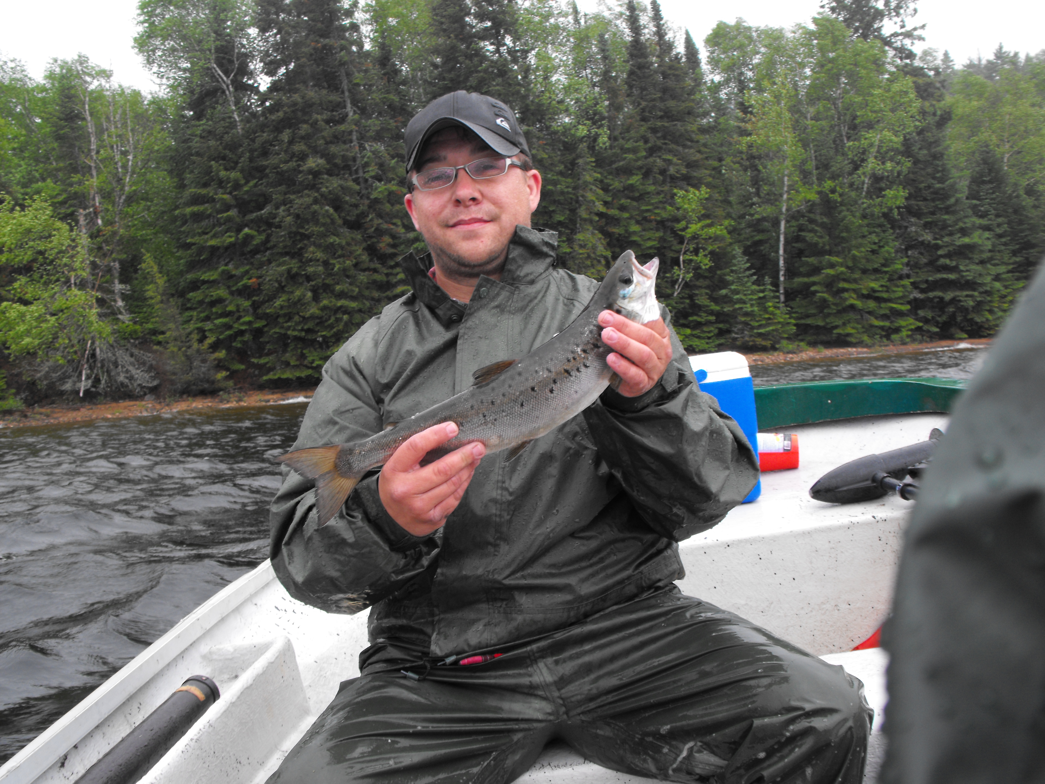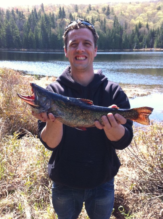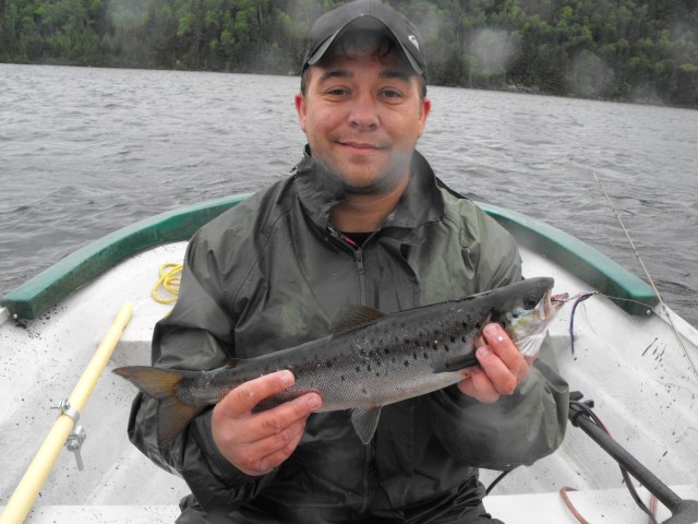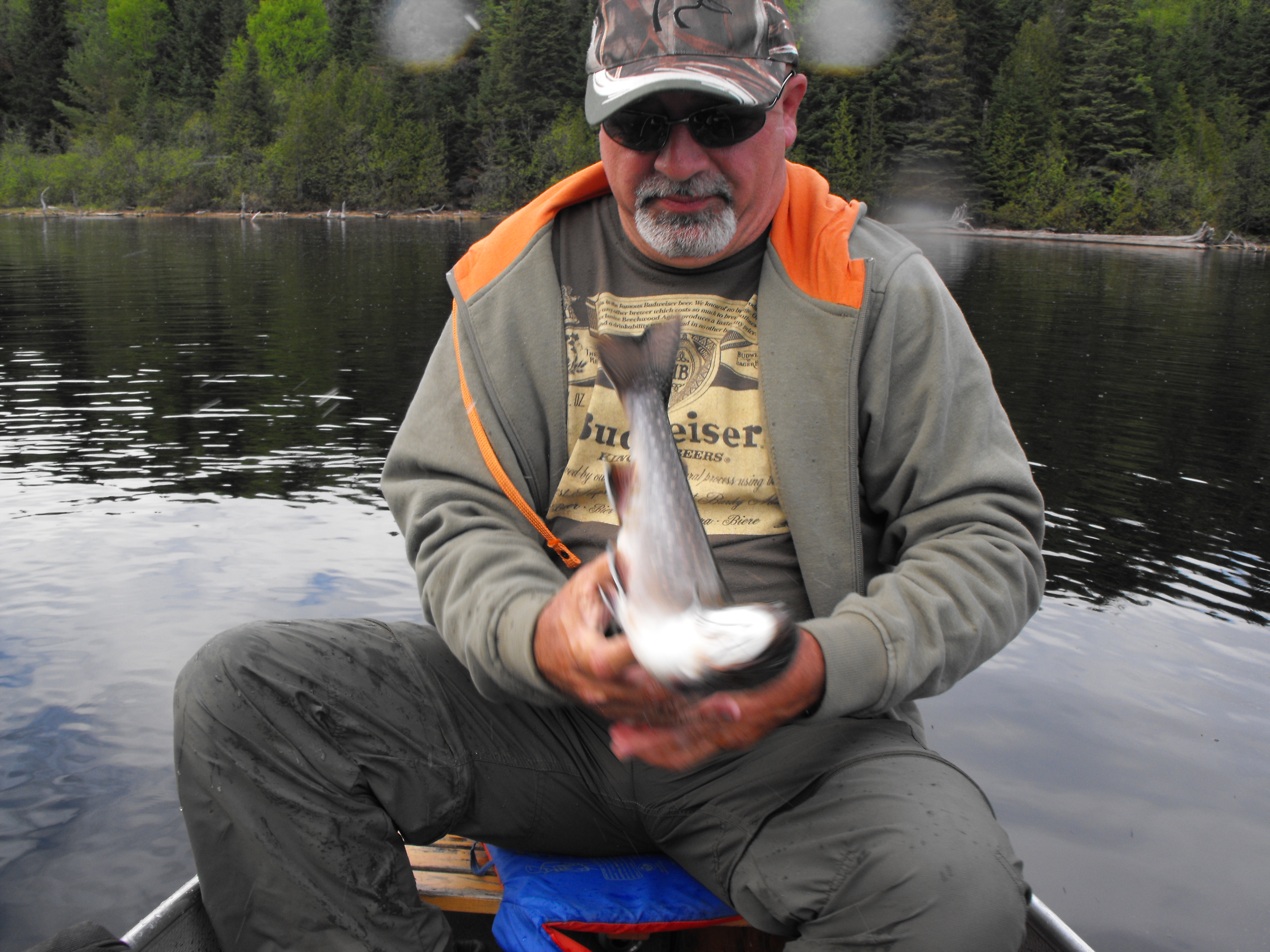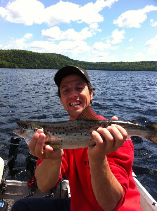 Jonathan tres heureux de ce faire photographier avec cette ouananiche capturée avec la Walter du Sorcier une création en honneur de sont grand père qui etait guide de pêche sur ce fameux lac Sorcier